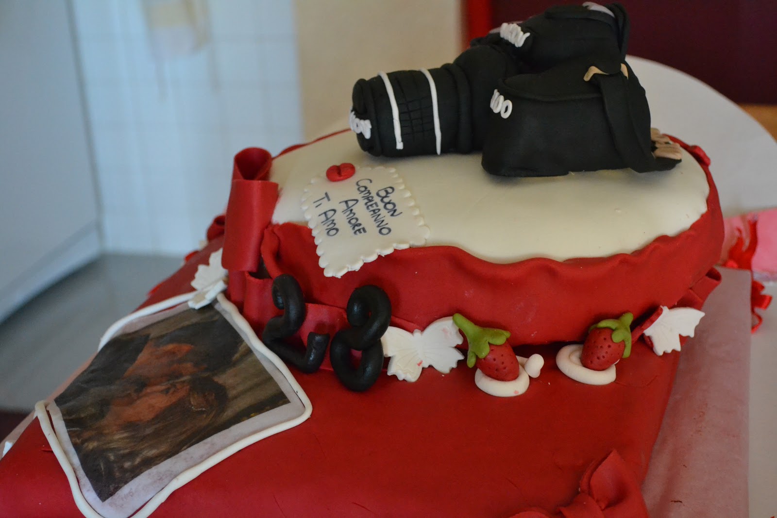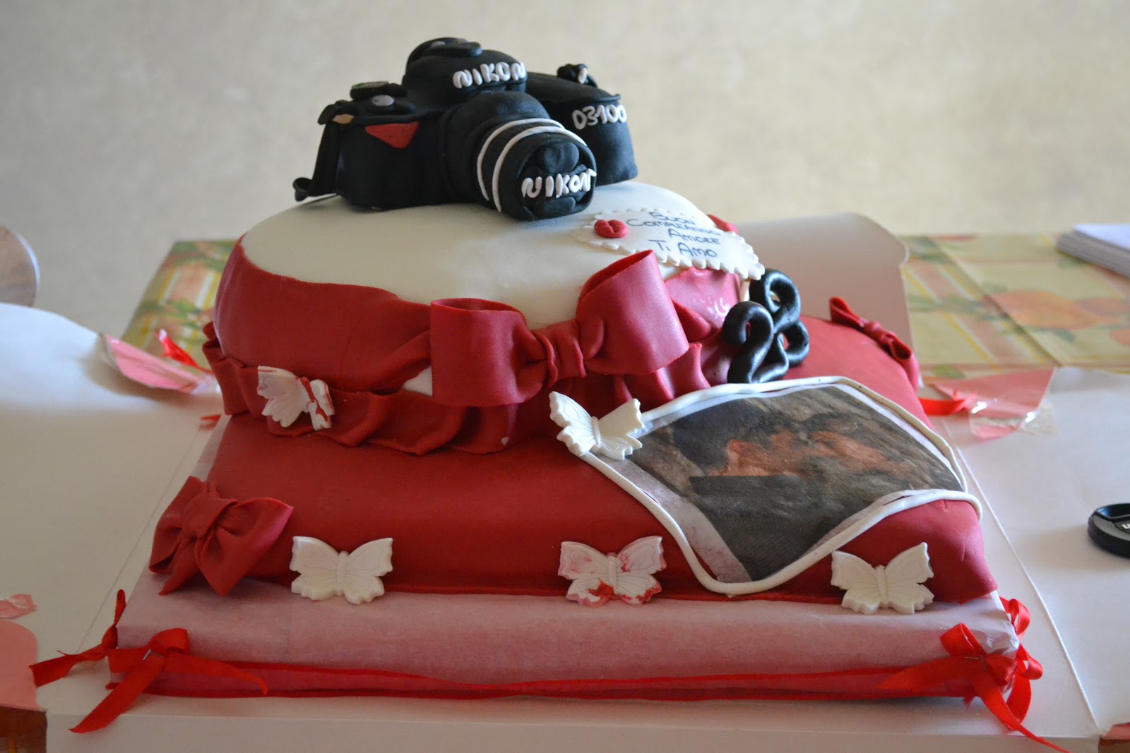 Ho deciso di realizzare questa struttura, discostandomi dal mio progetto originale che prevedeva solo il piano di torta bianco, solo perchè amo il mio amore e con questa torta ho voluto dimostrargli quanto desidero renderlo felice e stupirlo, soprattutto riproducendo un oggetto che per lui rappresenta quotidianeità, ossia la macchina fotografica della nikon.